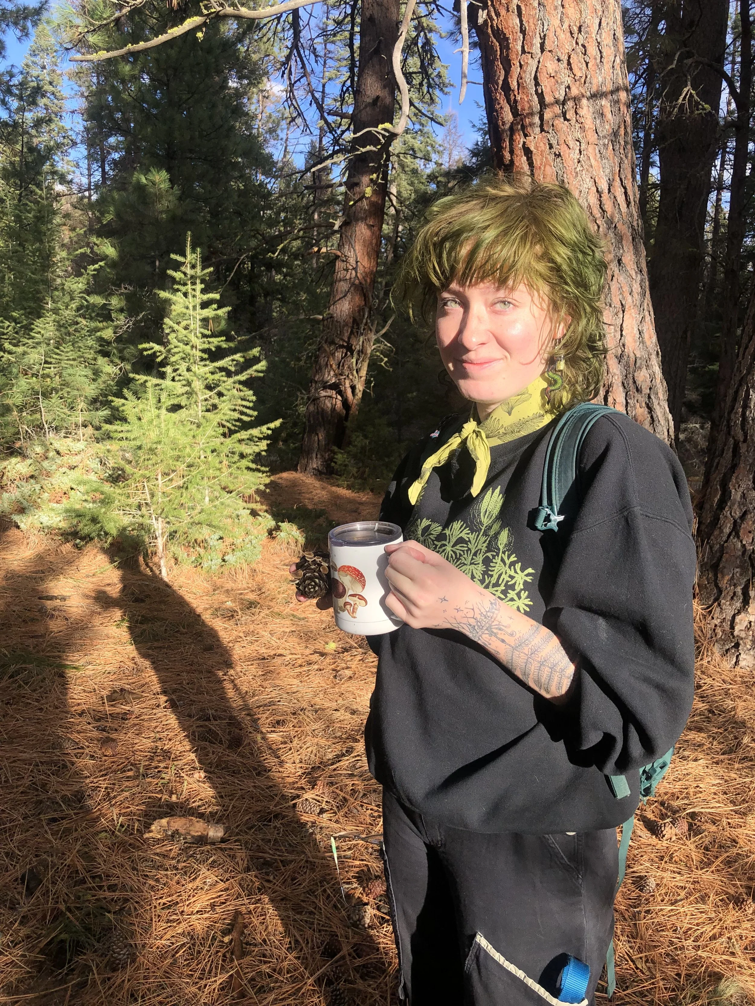 Erynn McNeill is an artist, botanist, and scientific illustrator. While obtaining their Bachelor of Science in Biology they worked throughout the backcountry of Montana, Idaho and Alaska tracking animals and recording plant species until 2020 when forced isolation brought back an old love of creating art. Taking inspiration from these wilderness experiences, they created Up Moss Creek Studio in 2021 as a habitat for experimentation where they combine their knowledge of botany, mycology and multiple art mediums to create unique mixed media paintings inspired by 19th century botanical illustration. While their personal style gives their paintings an air of dark naturalism and fantasy, they aim to highlight the endangered mossy worlds within the Northern Rockies's diverse ecosystems and hope that through showing others what they admire when wandering creekside through the mountains it will inspire them to look closely, step lightly, and protect the world's natural environments. They are currently based in the Bitterroot Valley of Montana where they share a home with their partner Brandon, dog Dagwood, and cat Orion.