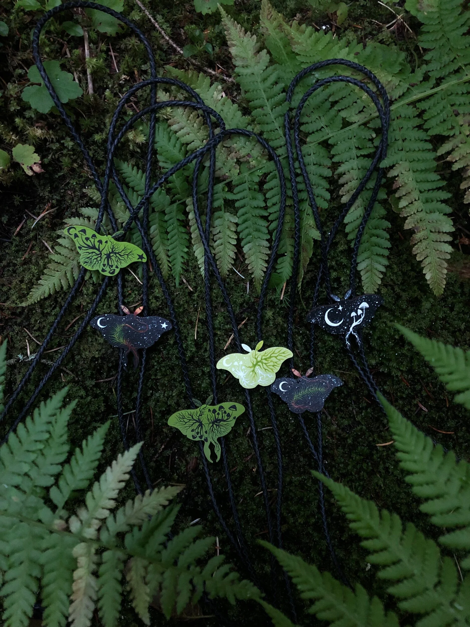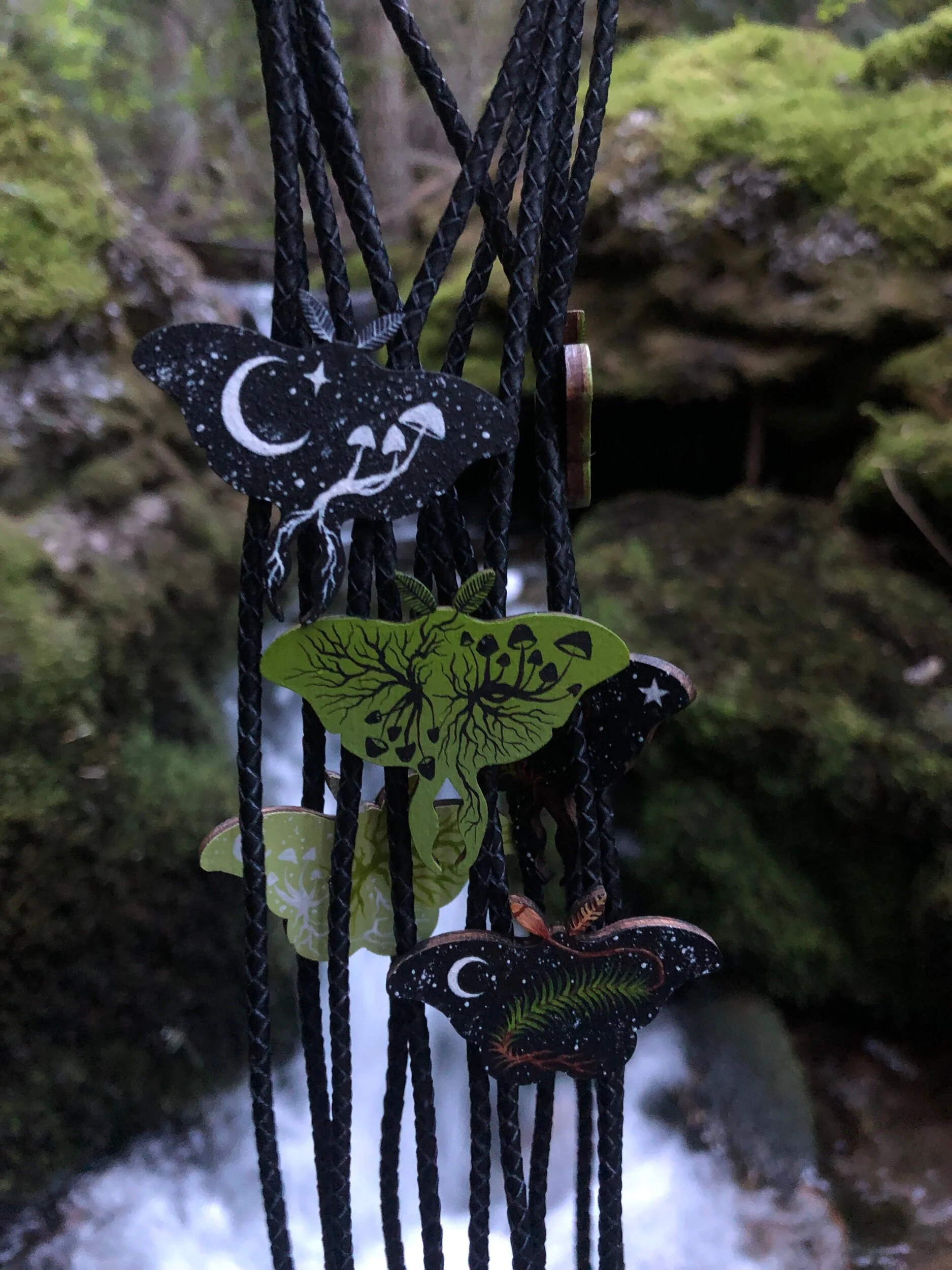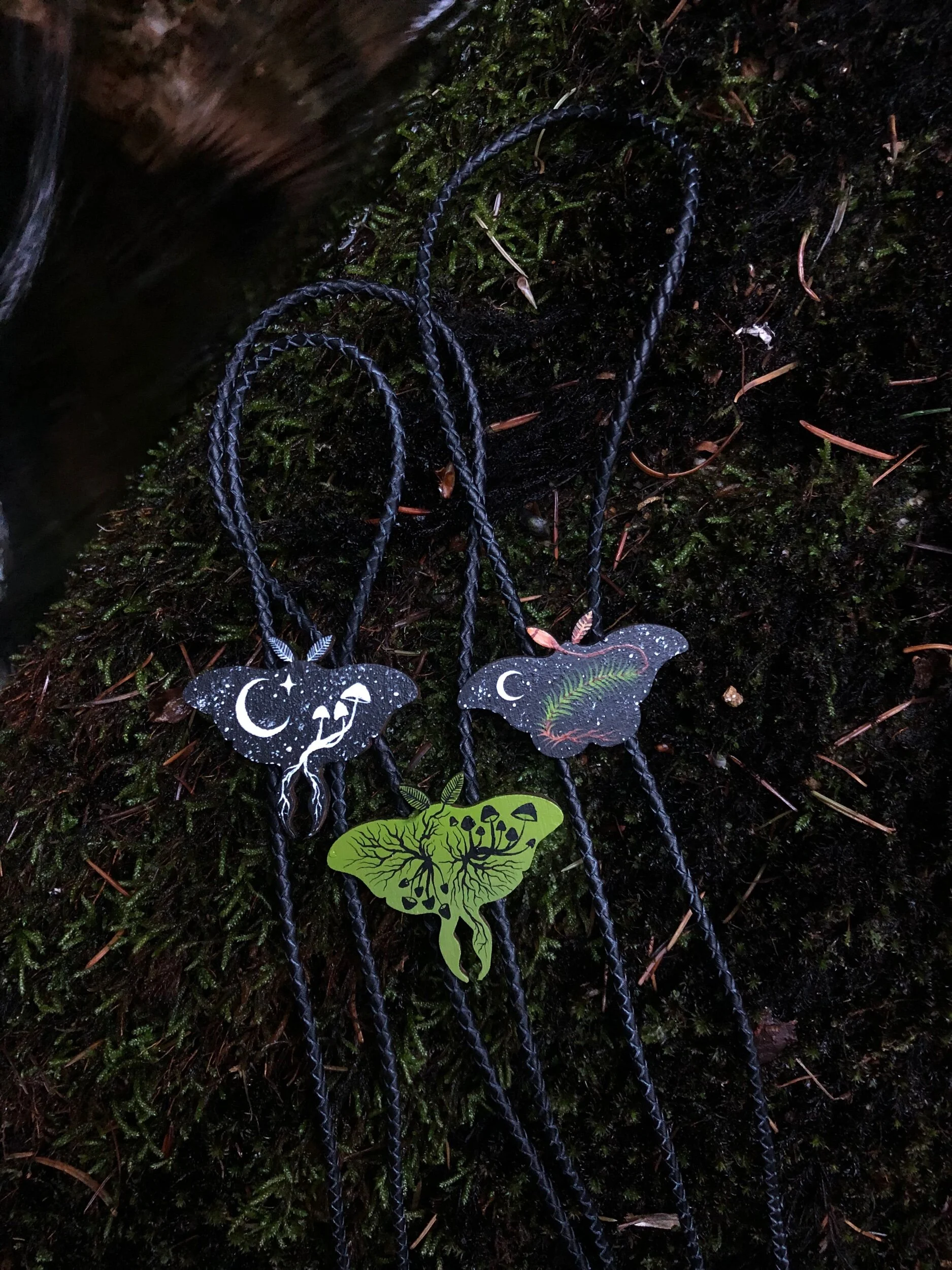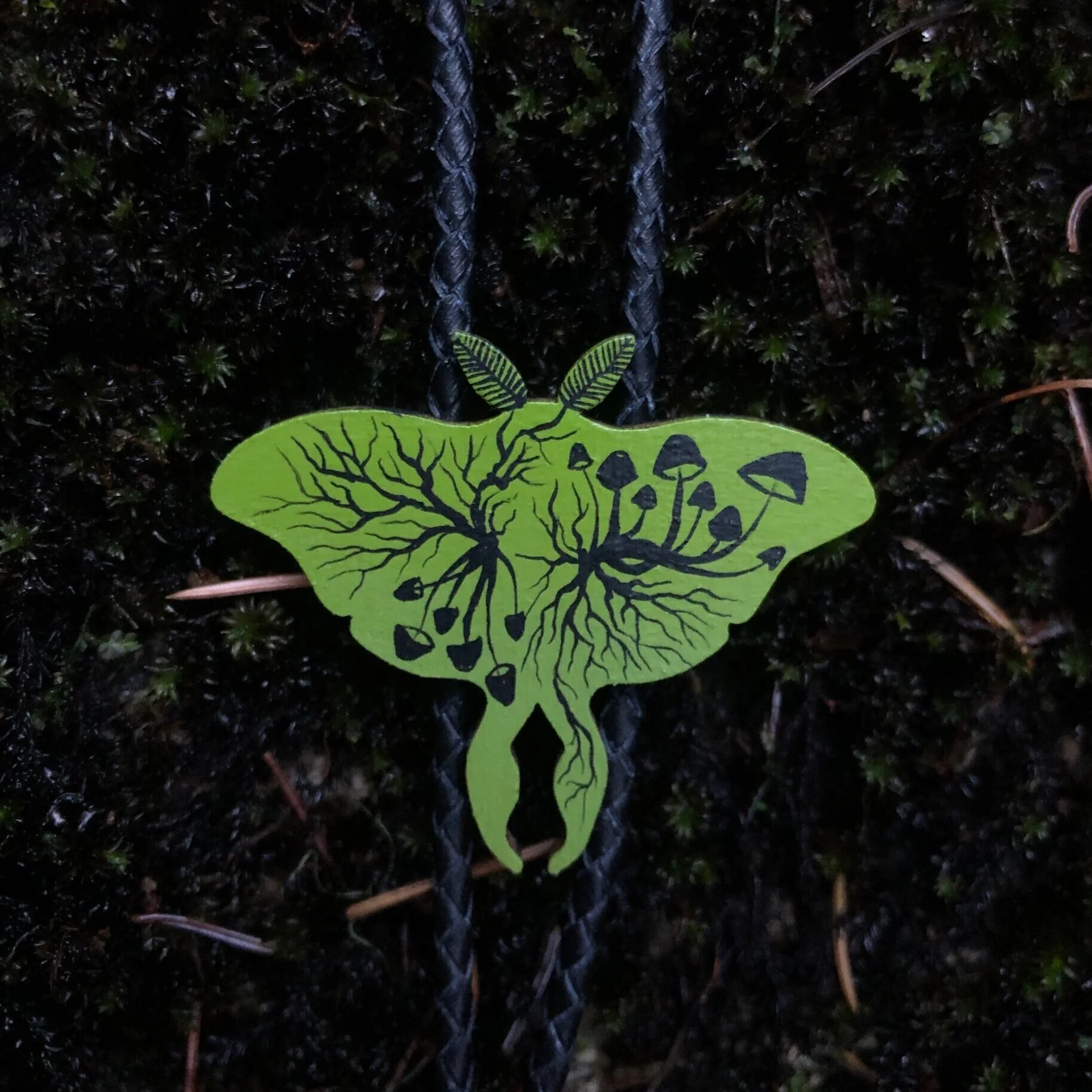 The mycelium moth bolo tie in lichen green is made out of hand-painted wood. The green color is inspired by Wolf Lichen (Letharia vulpina) and the design is inspired by the mycorrhizal network that grows beneath mushrooms. Each bolo is hand painted with acrylic and varnished with two layers of weather proof non-yellowing matte wood varnish.